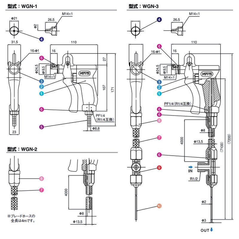 2:シャワーノズル1個装着、ストレートノズルノズル1個同梱、ブレードホース継手(ガン側)、ブレードホース(内径Φ8mmX外径Φ13.5mmX長さ4m)