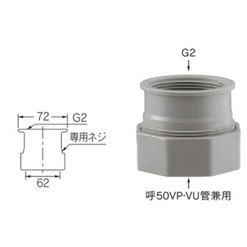 G11/2・G2トラップに50A塩ビ管を接続できます。