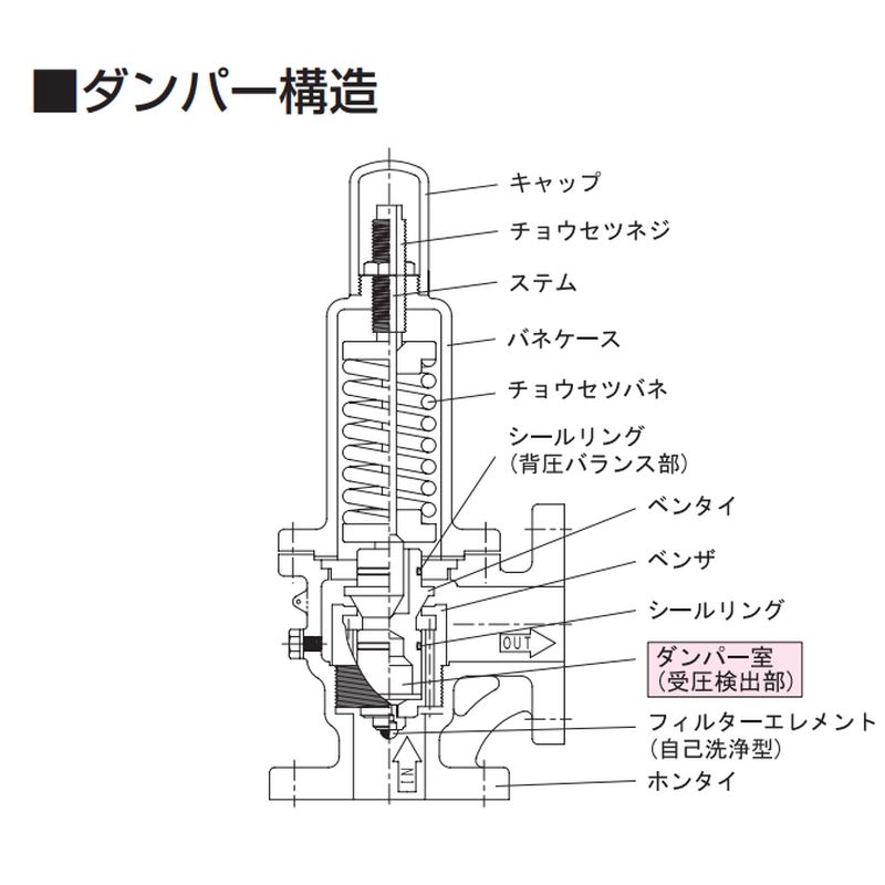 弁体部のダンパー機構により、高圧時の脈動圧、変動圧による弁体の急激な運動を抑制します。