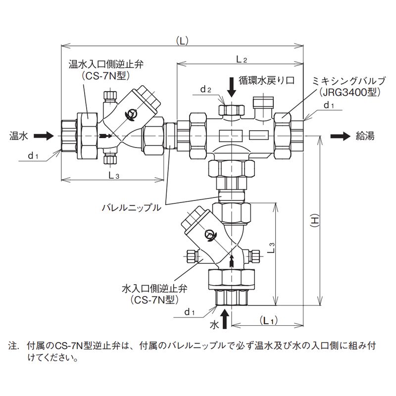 必ずCS−7N型逆止弁をJRG3400型ミキシングバルブの入口側に取り付けてご使用ください。