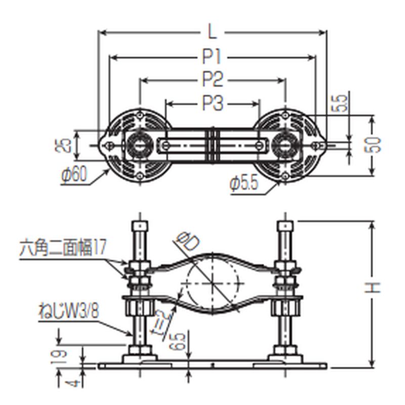 多数の配管サイズを兼用できる床面の横走り排水管用の支持金具です。