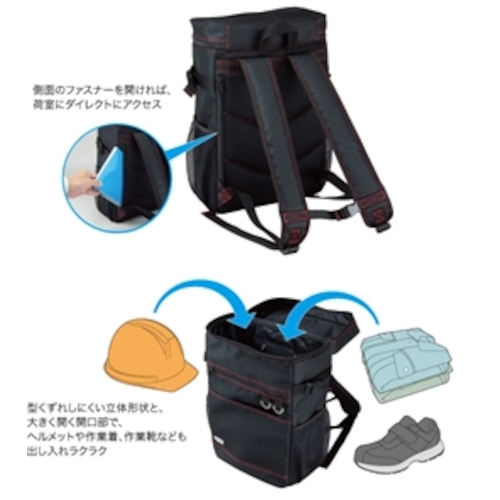型くずれしにくい立体形状と、大きく開く開口部で、ヘルメットや作業着、作業靴なども出し入れラクラクです。