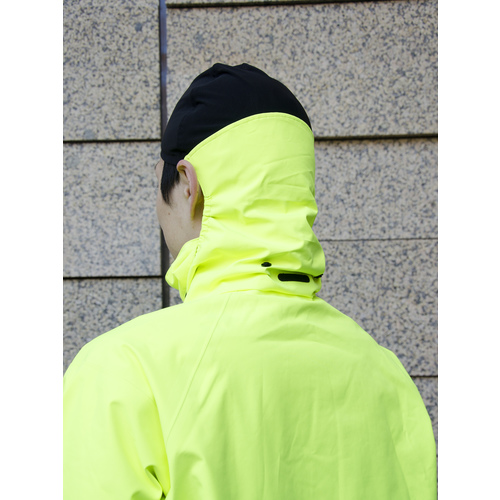 メットインフードでヘルメット装着時でも首元からの雨の進入を防ぎ、視界と音も妨げないため安全に作業が可能です。