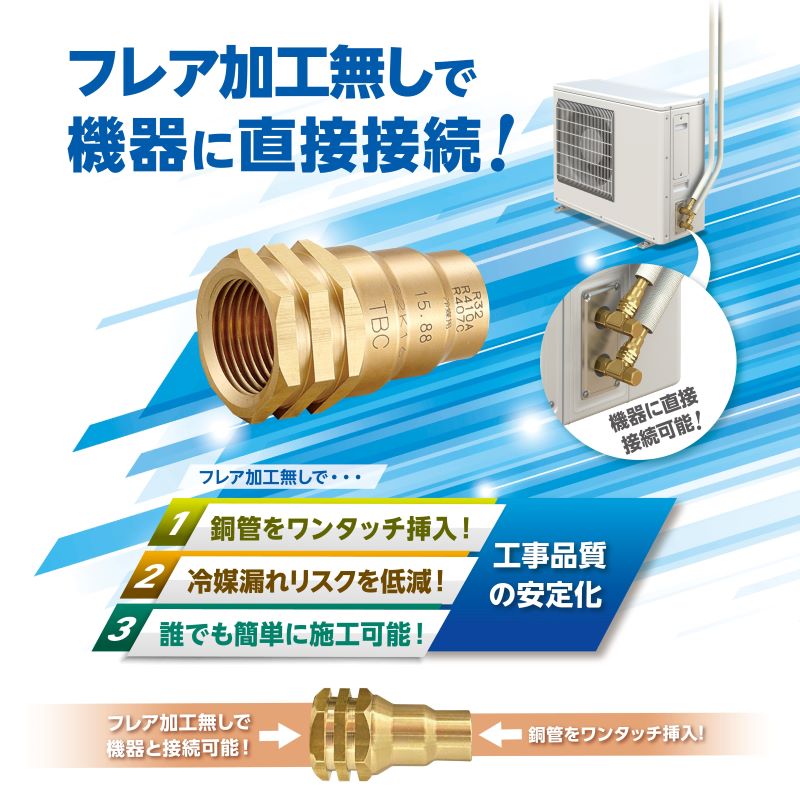 冷媒配管用銅管を“火無し”でワンタッチ接続ができます。