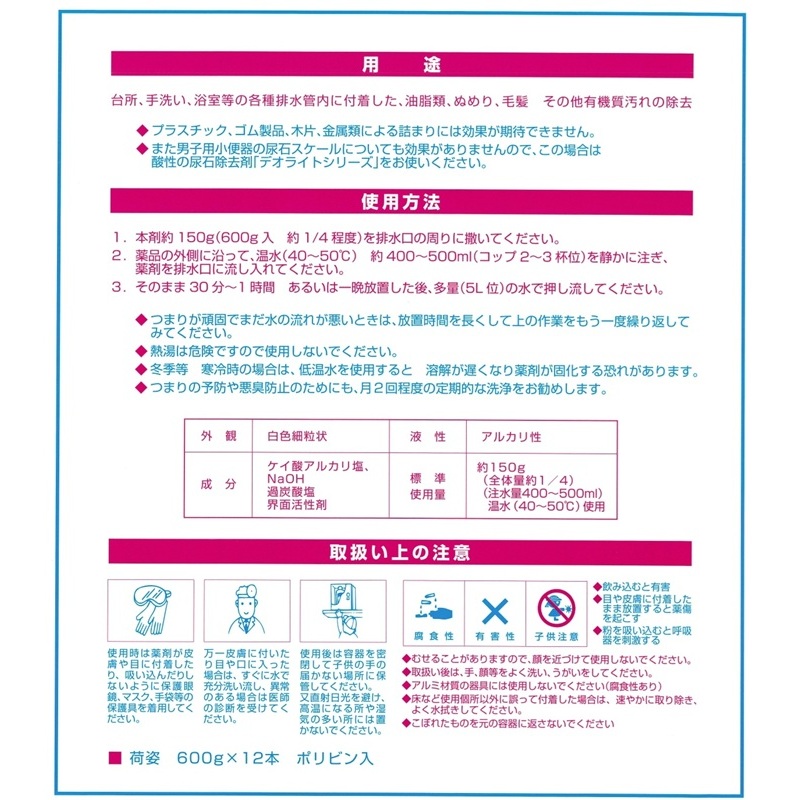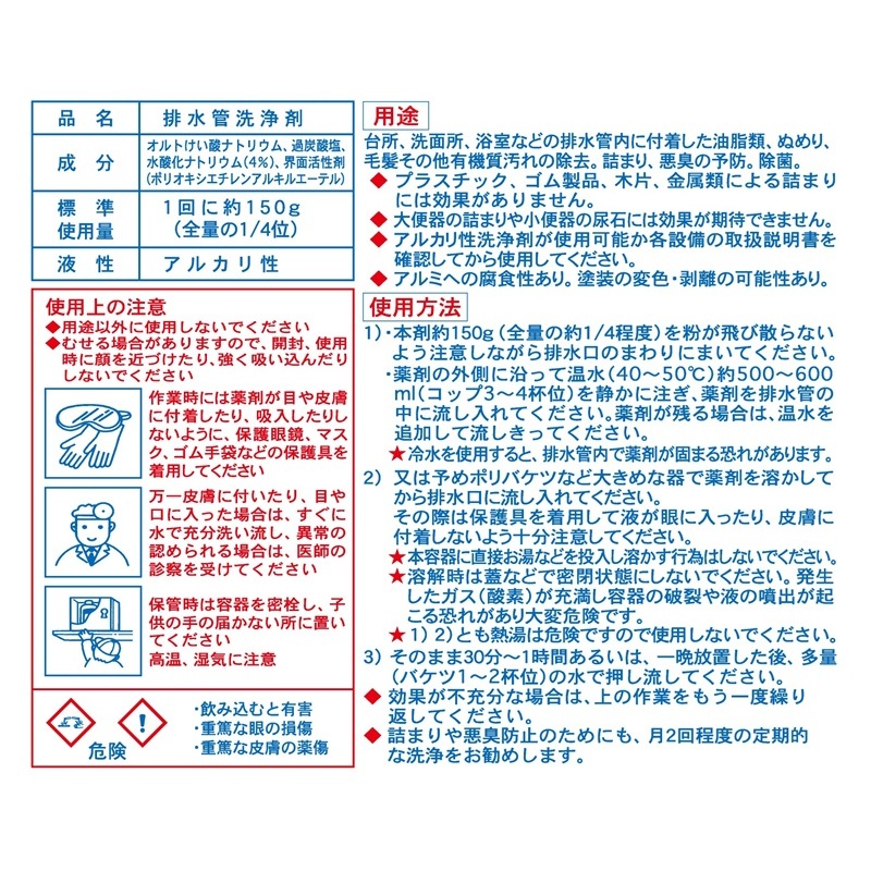 本剤100〜150g(600g約1/4程度)を排水口の周りに撒いてください。