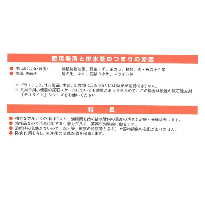 台所、洗面所、浴室などの排水管詰りの原因となる油脂・タンパク質汚れ除去