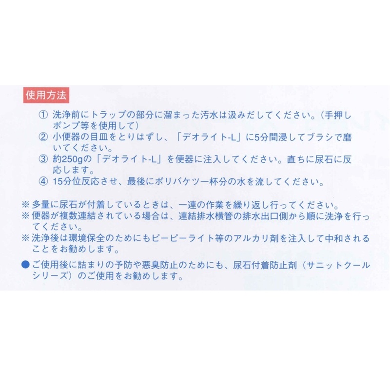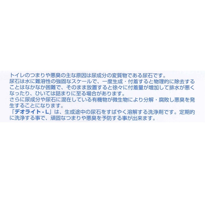 「デオライトL」はこの尿石を素早く溶解・除去して、頑固な詰まりや悪臭を解消する強力な洗浄剤です。