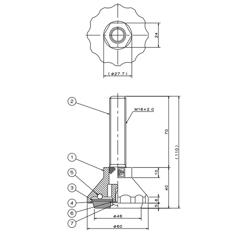 荷重を分散する円錐形を採用し、旋回部の接触部にはベアリングの代わりにスラストリングを使用。手で回転操作を容易にできる凹凸を設けたプラスチック製アジャスターフット。