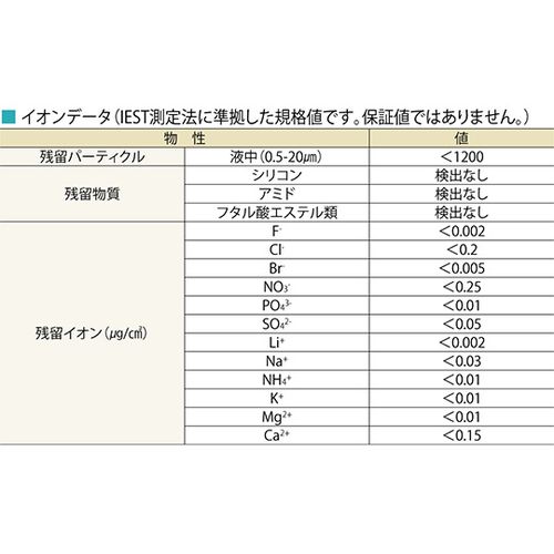 SO42-(硫酸イオン):<0.05、Li+:<0.002、