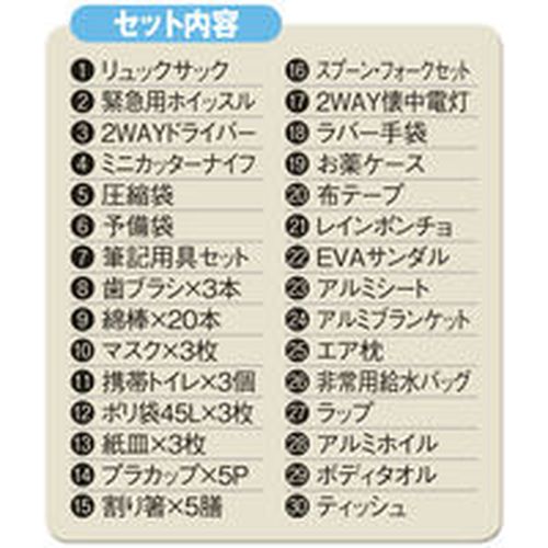 リュックサック、緊急用ホイッスル、2WAYドライバー、ミニカッターナイフ、圧縮袋、予備袋(小銭入れ)、筆記用具セット、歯ブラシ3本、綿棒20本、マスク3枚、携帯トイレ3個、ポリ袋45L 3枚、紙皿3枚、プラカップ5P、割り箸5膳、スプーン・フォークセット、2WAY懐中電灯、ラバー手袋、お薬ケース、布テープ、レインポンチョ、EVサンダル、アルミシート、アルミブランケット、エア枕、非常用給水バック、ラップ、アルミホイル、ボディタオル、ティッシュ