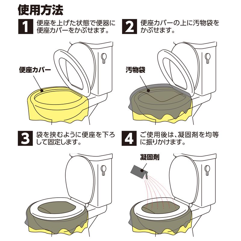 凝固剤×50、汚物袋(黒)×50、便座カバー(黄色)×2、処理袋(白)×10