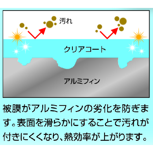 アルミフィンをコートし、保護することで機器への負担を減らし熱効率UP。