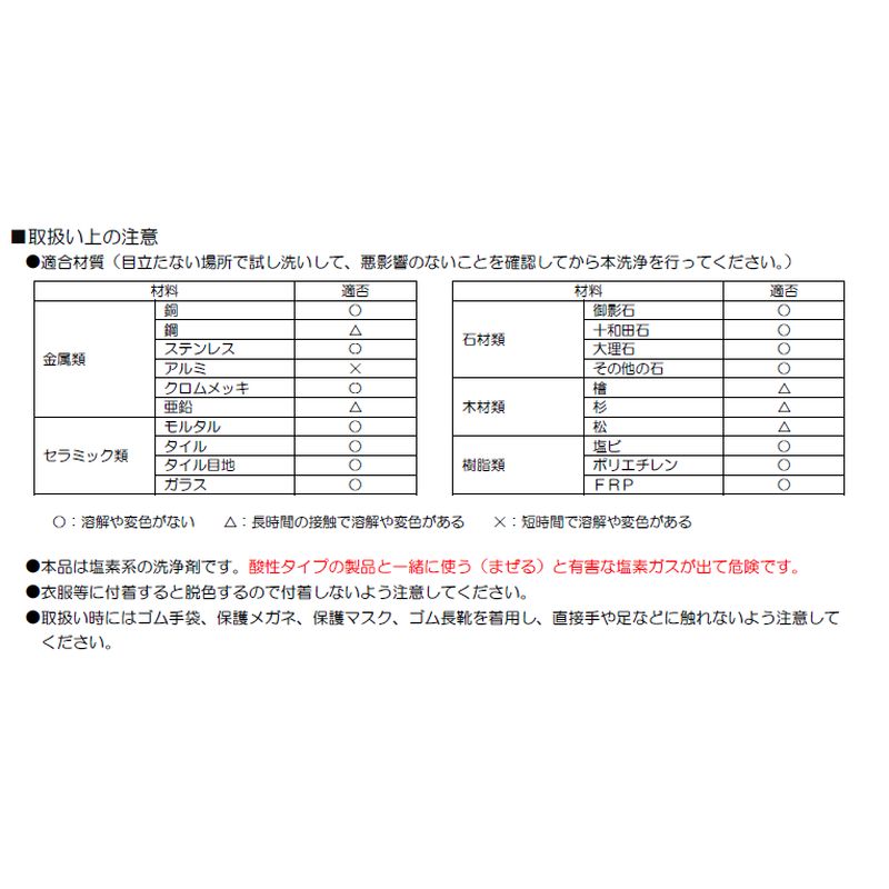 本品は塩素系の洗浄剤です。酸性タイプの製品と一緒に使う(まぜる)と有害な塩素ガスが出て危険です。