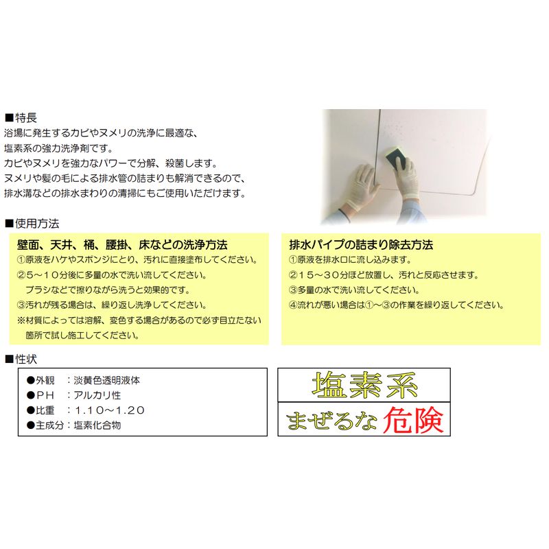 浴場に発生するカビやヌメリの洗浄に最適な、塩素系の強力洗浄剤です。