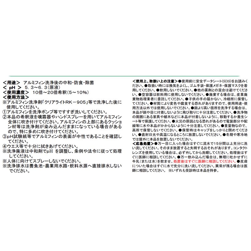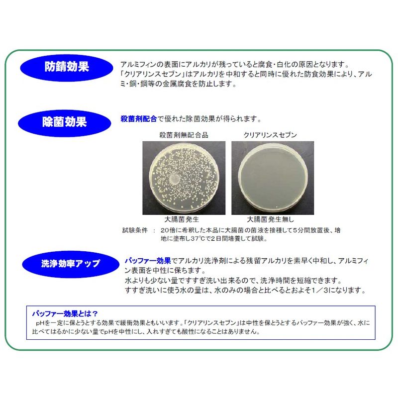 洗浄効率アップ:バッファー効果でアルカリ洗浄剤による残留アルカリを素早く中和し、アルミフィン表面を中性に保ちます。水よりも少ない量ですすぎ洗い出来るので、洗浄時間を短縮できます。すすぎ洗いに使う水の量は、水のみの場合と比べるとおよそ1/3になります。