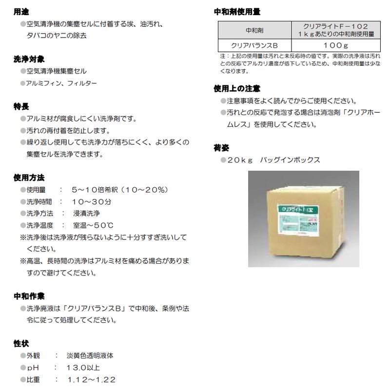 クリアライトF−102は、アルミ材の腐食を抑えた空気清浄機集塵セル洗浄剤です。