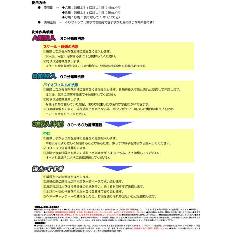 A剤は酸性の強い製品、B剤は酸化剤です。C剤は中和剤です。取扱い時には換気をよくし、ゴム手袋・保護メガネ・保護マスクを着用してください。飲用しないでください。使用場所、保管場所付近には熱源、可燃物、引火物を置かないでください。また、みだりに火気を使用しないでください。他の薬剤との混合、異物との接触は避けてください。使用方法を厳守してください。有毒なガスが発生しますので、塩素系の薬剤とは混合しないでください。(A剤)空容器は飲料用に使用しないでください。金属製の容器は使用しないでください。廃棄する場合は、産業廃棄物処理業者に委託してください。子供の手の届かない、冷暗所に保管してください。入浴剤(生薬タイプやpHの高いタイプ等)を使用している場合は、清水に張り替えてから洗浄作業を行なってください。珪藻土、カートリッジ式フィルター、微生物担持ろ材等を使用している場合は、ろ材を取り出すか、ろ過器を通さないで洗浄してください。