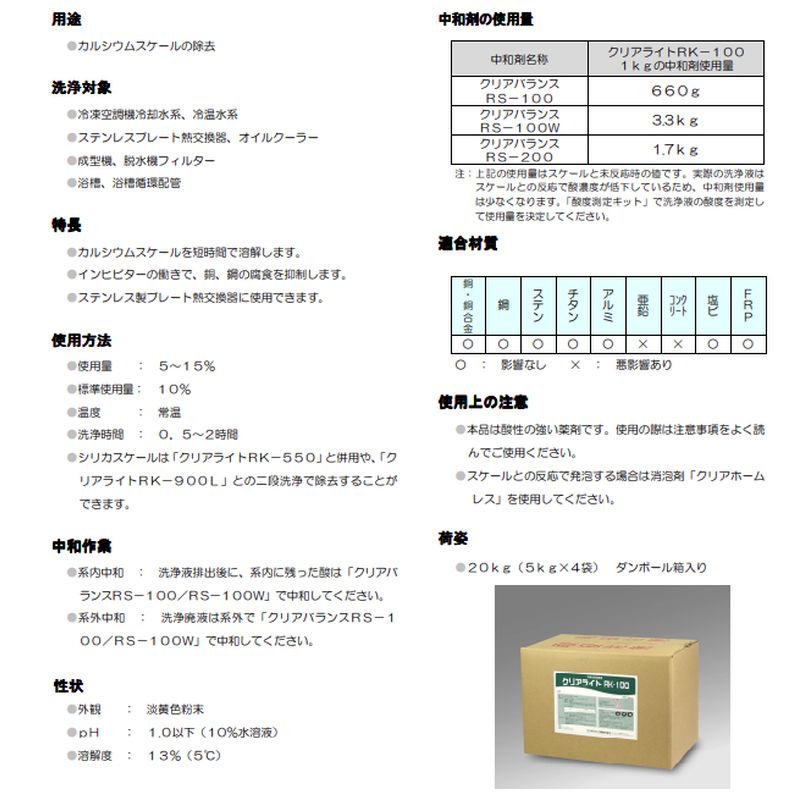 クリアライトRK−100はカルシウムスケールなどの硬質スケールを除去する粉末の酸性洗浄剤です。