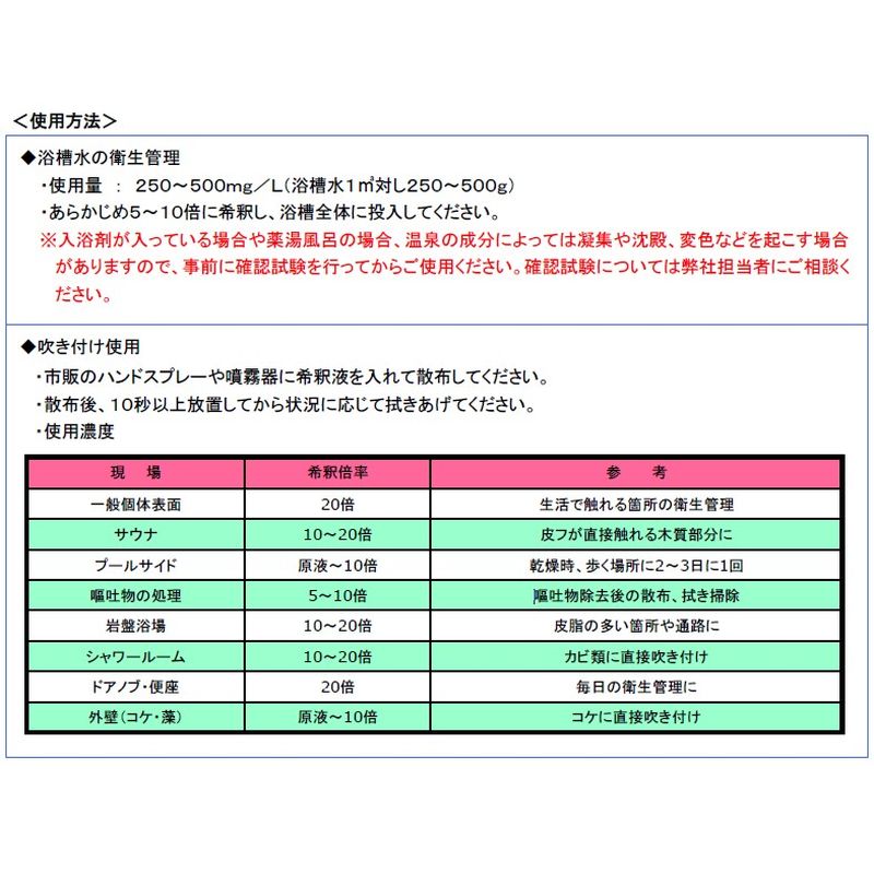 ・使用量:250~500mg/L(浴槽水1m3対し250~500g)