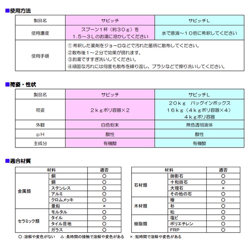 適合材質(○:溶解や変色がない △:長時間の接触で溶解や変色がある ×:短時間で溶解や変色がある)