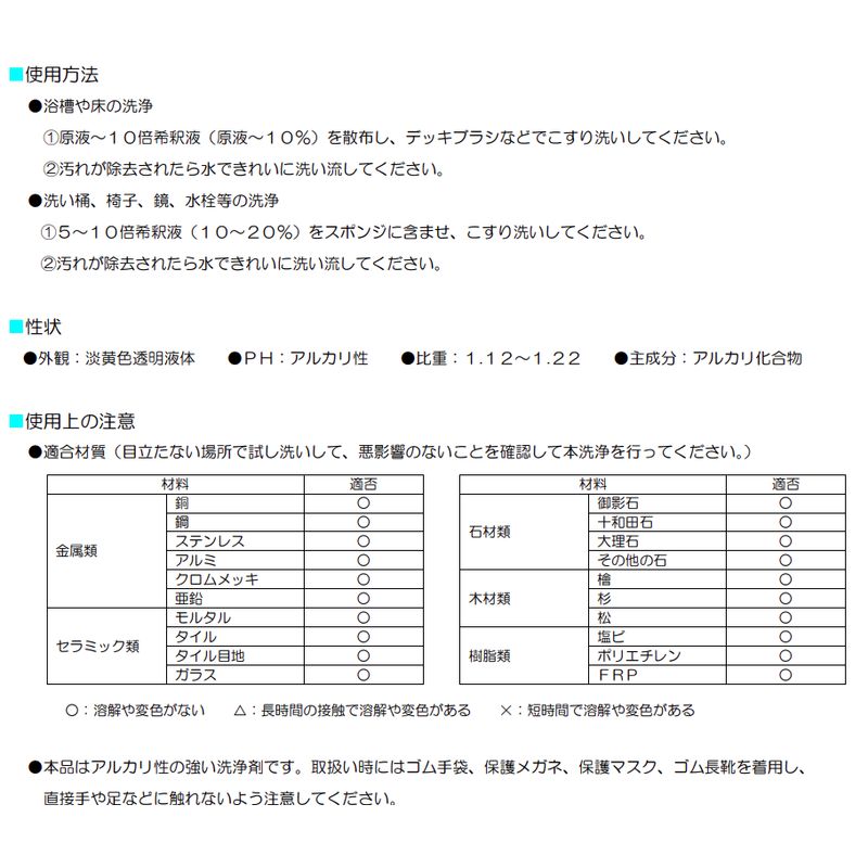 本品はアルカリ性の強い洗浄剤です。取扱い時にはゴム手袋、保護メガネ、保護マスク、ゴム長靴を着用し、直接手や足などに触れないよう注意してください